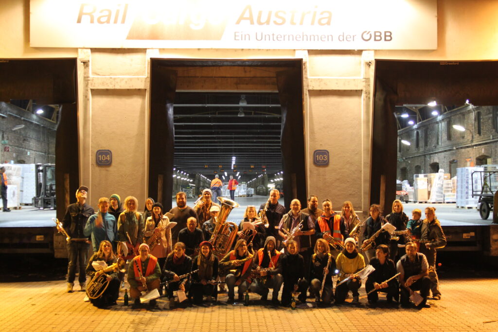 Sehnsucht und Fernweh als kollektive musikalische Erfahrung: Die „MusikarbeiterInnenkapelle“ wird in der „Werft Nordwest“, am Nordwestbahnhof zur „Temporären Hafenarbeiter*innenkapelle“. Wo früher ein Donauarm floss, laden die Musiker*innen zur offenen Probe und zum gemeinsamen Konzert mit Workshop-Charakter. Auf dem Programm stehen u.a. Sehnsuchtshadern wie „La Paloma“, Seemanns- und Arbeiter*innen-Lieder. Der Workshop ist als partizipative Probe/Konzert angelegt und offen für alle Niveaus.
